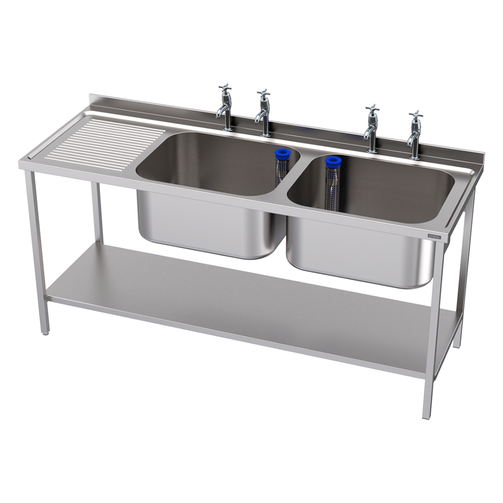 Fully stainless steel double bowl, single drainer utensil sink for use in hygienic environments.