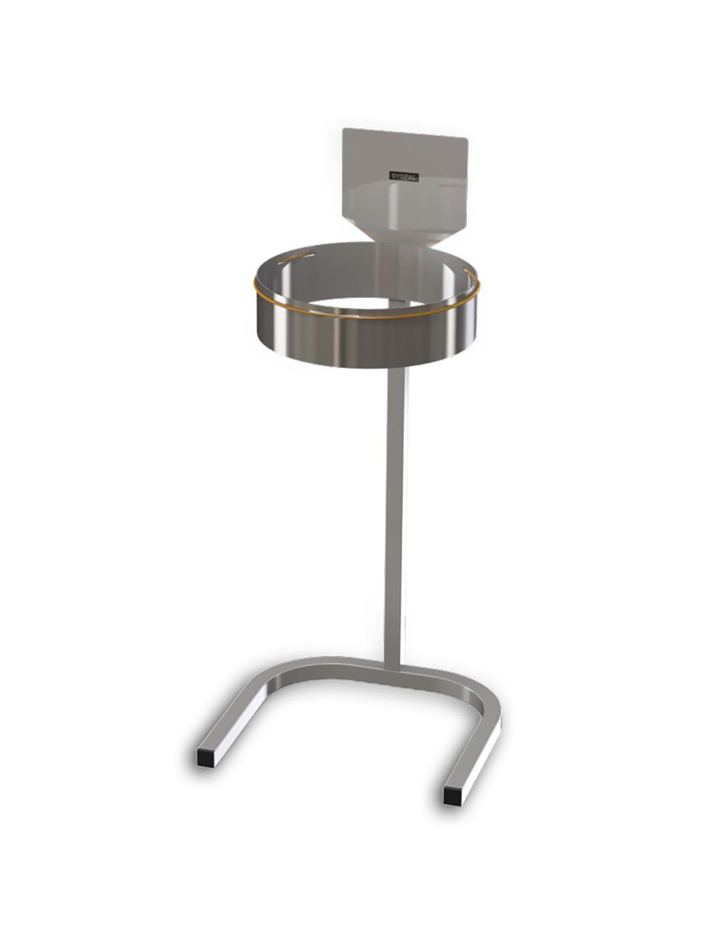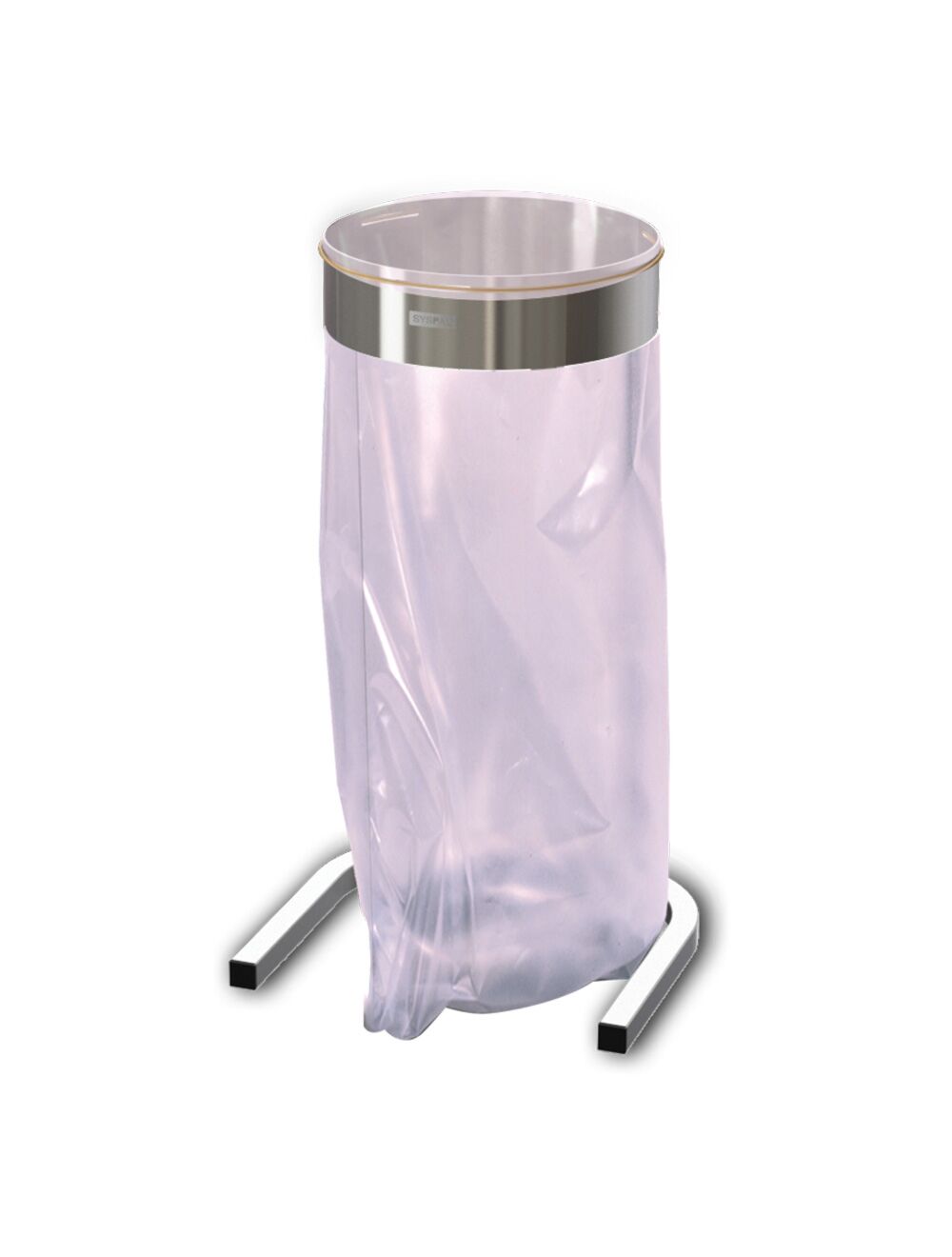 Free-standing polybag holder with retaining clamp for efficient and hygienic waste disposal.