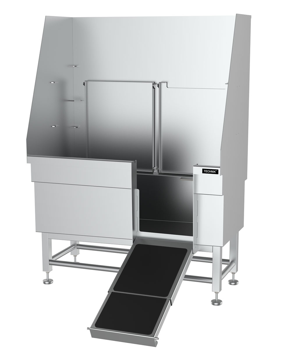 This stainless steel grooming bath is robust, hygienic and accessible with a folding ramp and door providing dog groomers and vets with a convenient grooming solution.