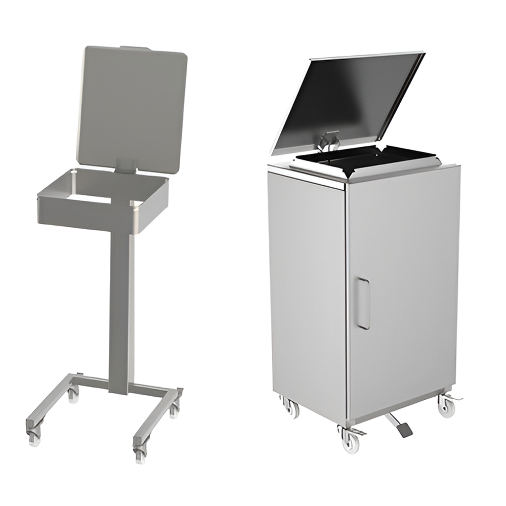 Stainless steel mobile waste bin ideal for use in hygienic environments.