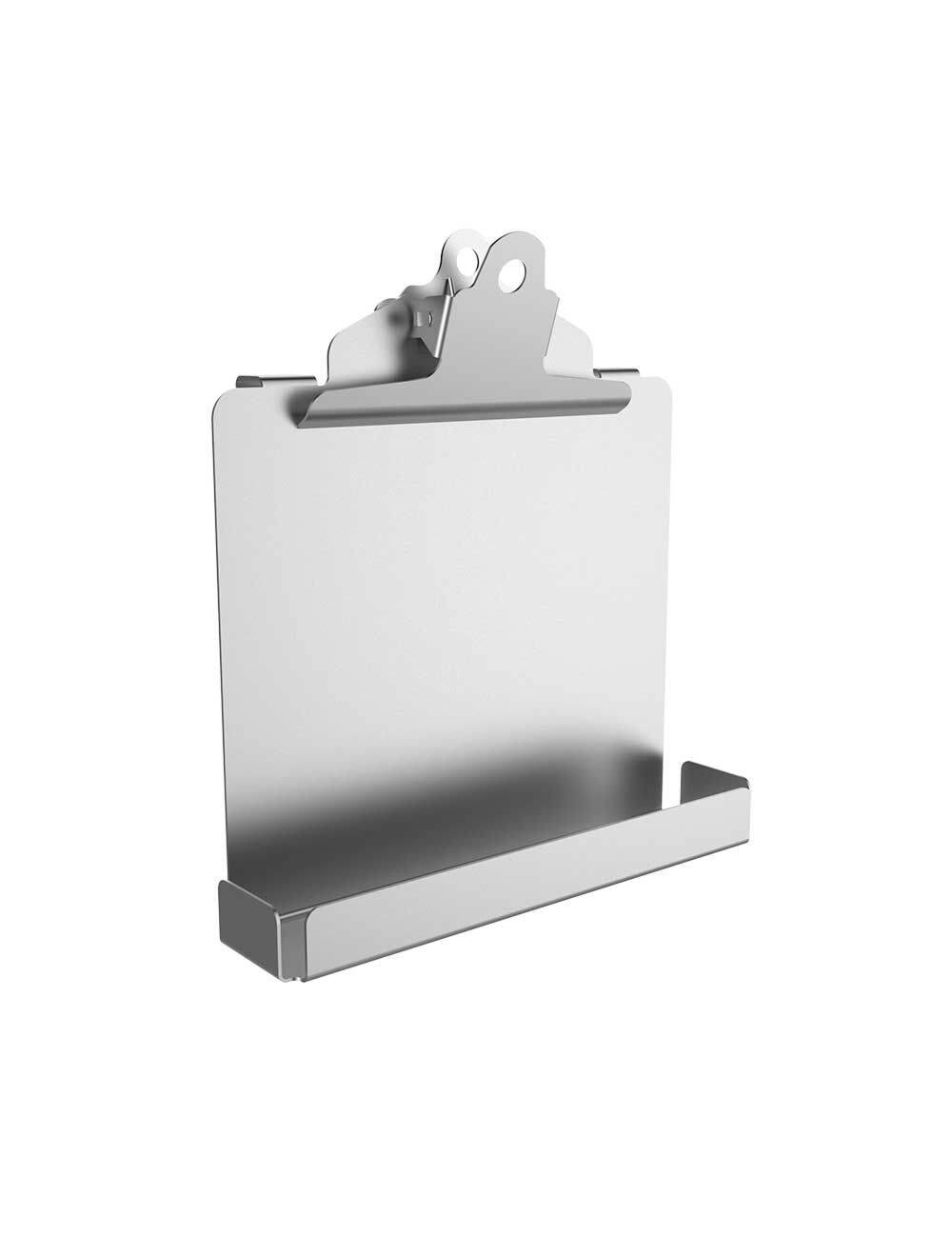 Hygienic stainless steel clipboards for easy document storage in hygiene conscious environments with handy built-in pill tray.