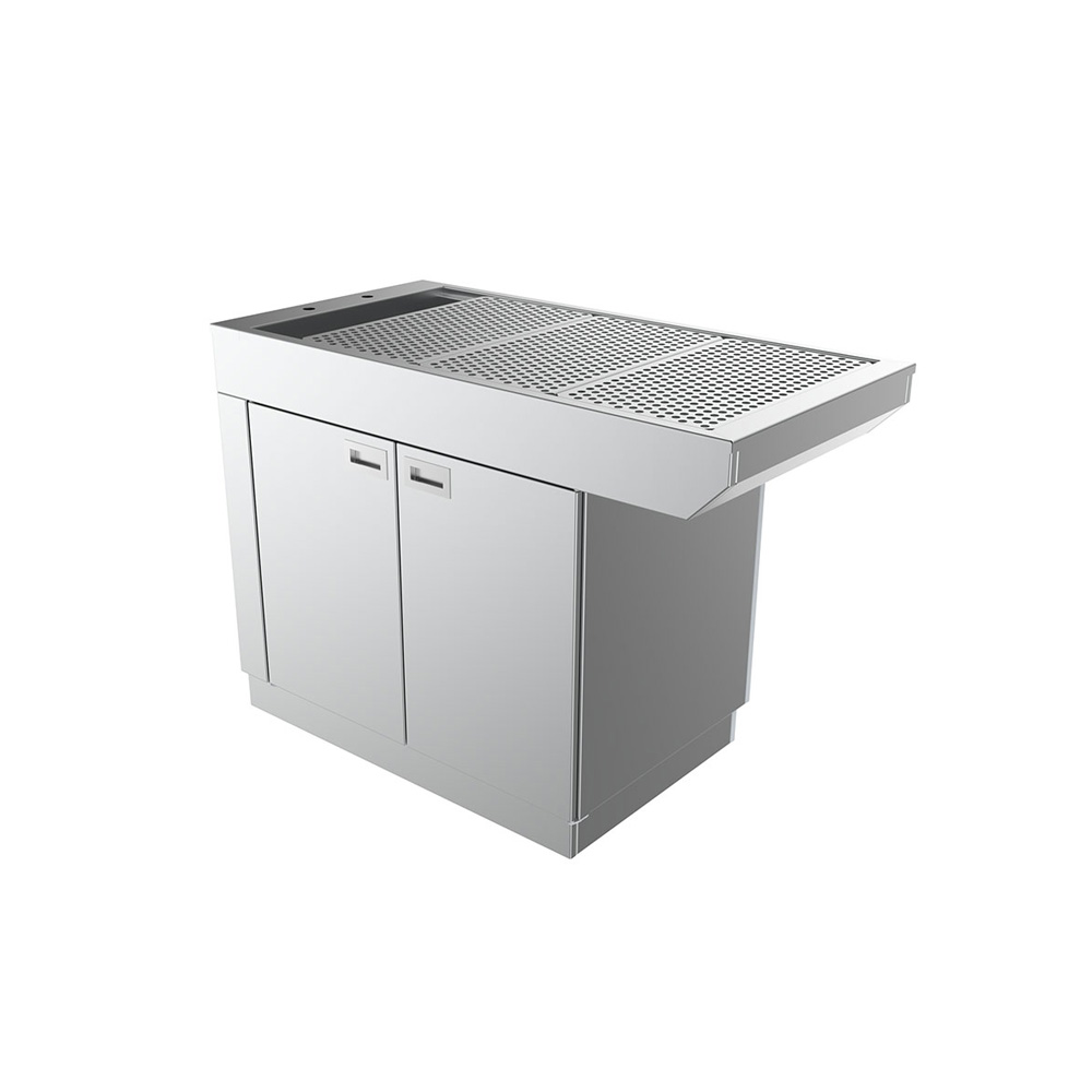 Durable stainless steel slimline tub table with cupboard storage underneath to maximise on space