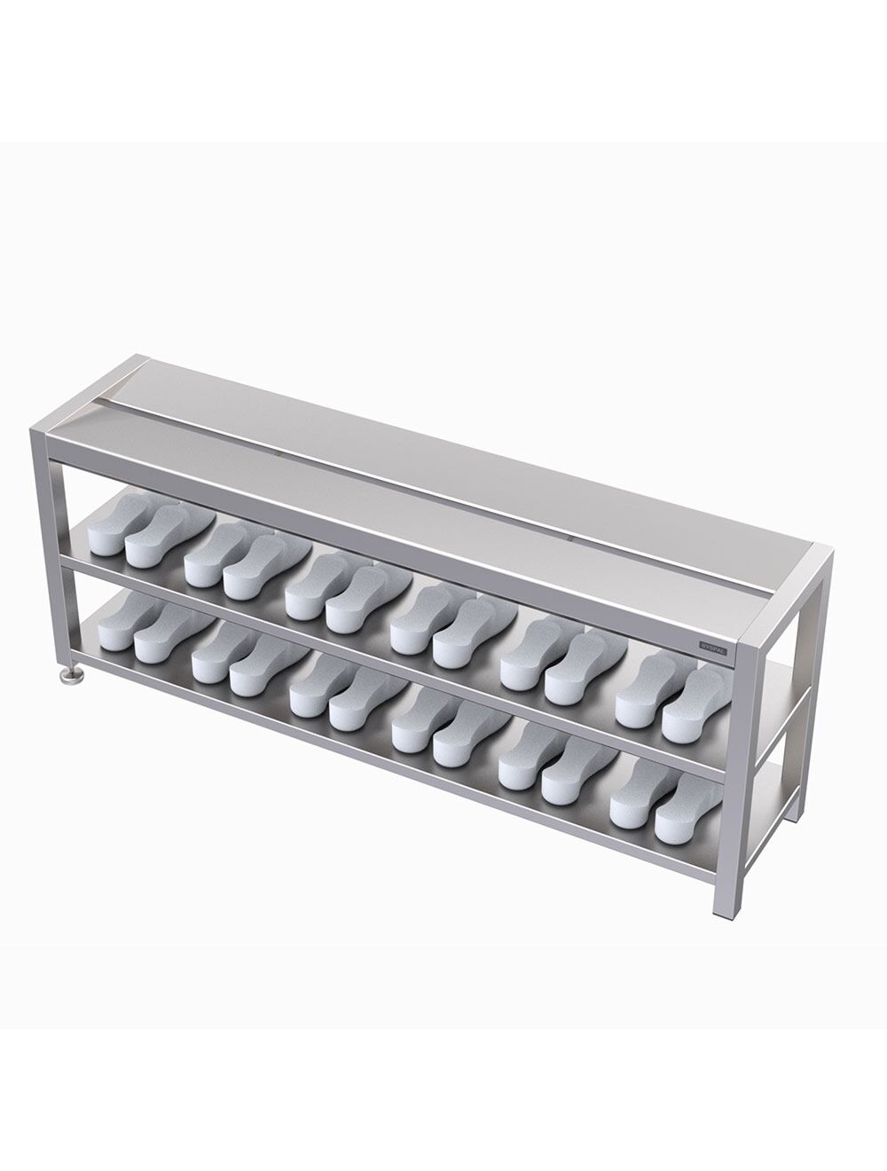 Two tier stainless steel shoe storage bench, ideal for use in changing areas in hygiene conscious environments.